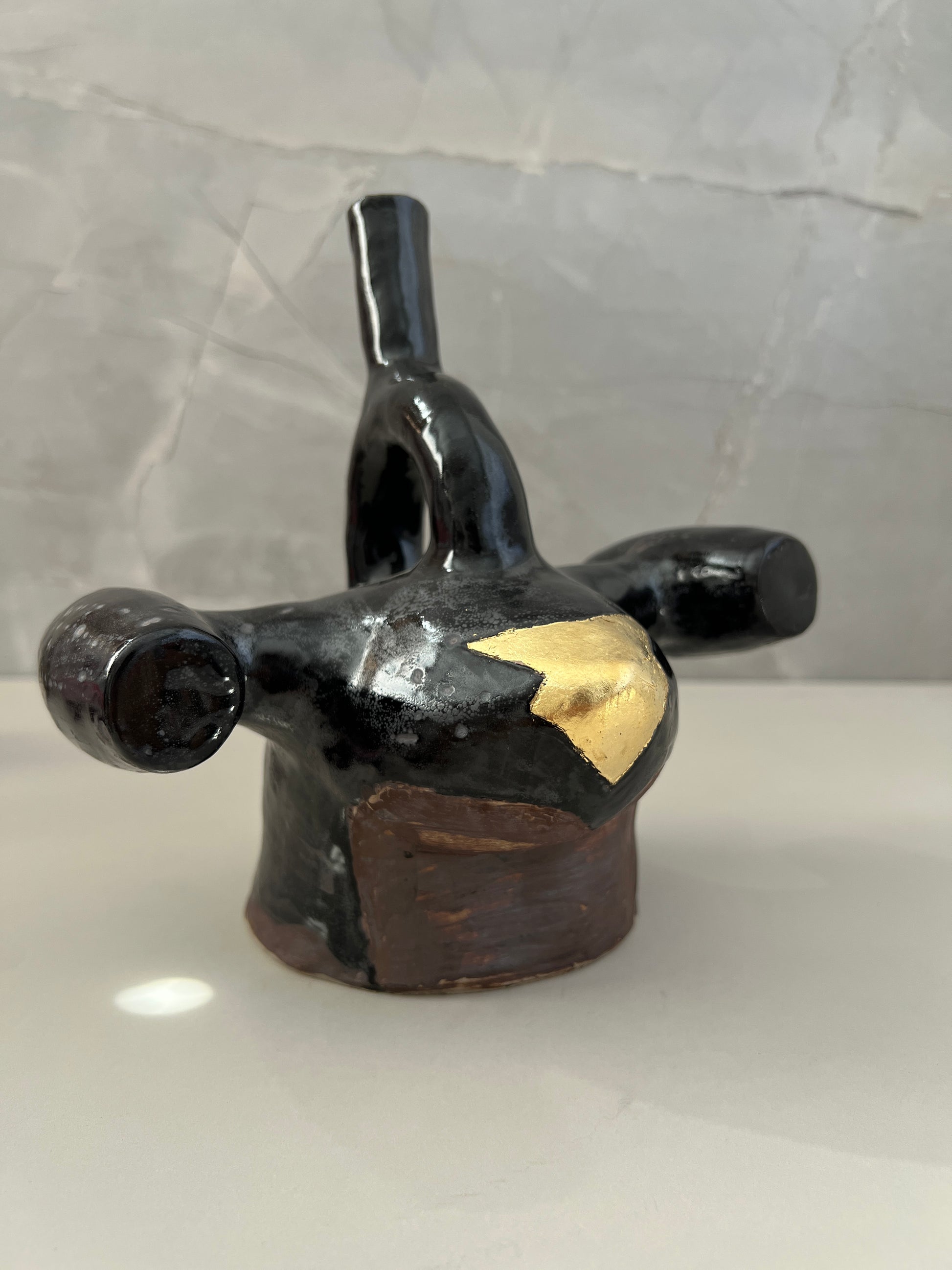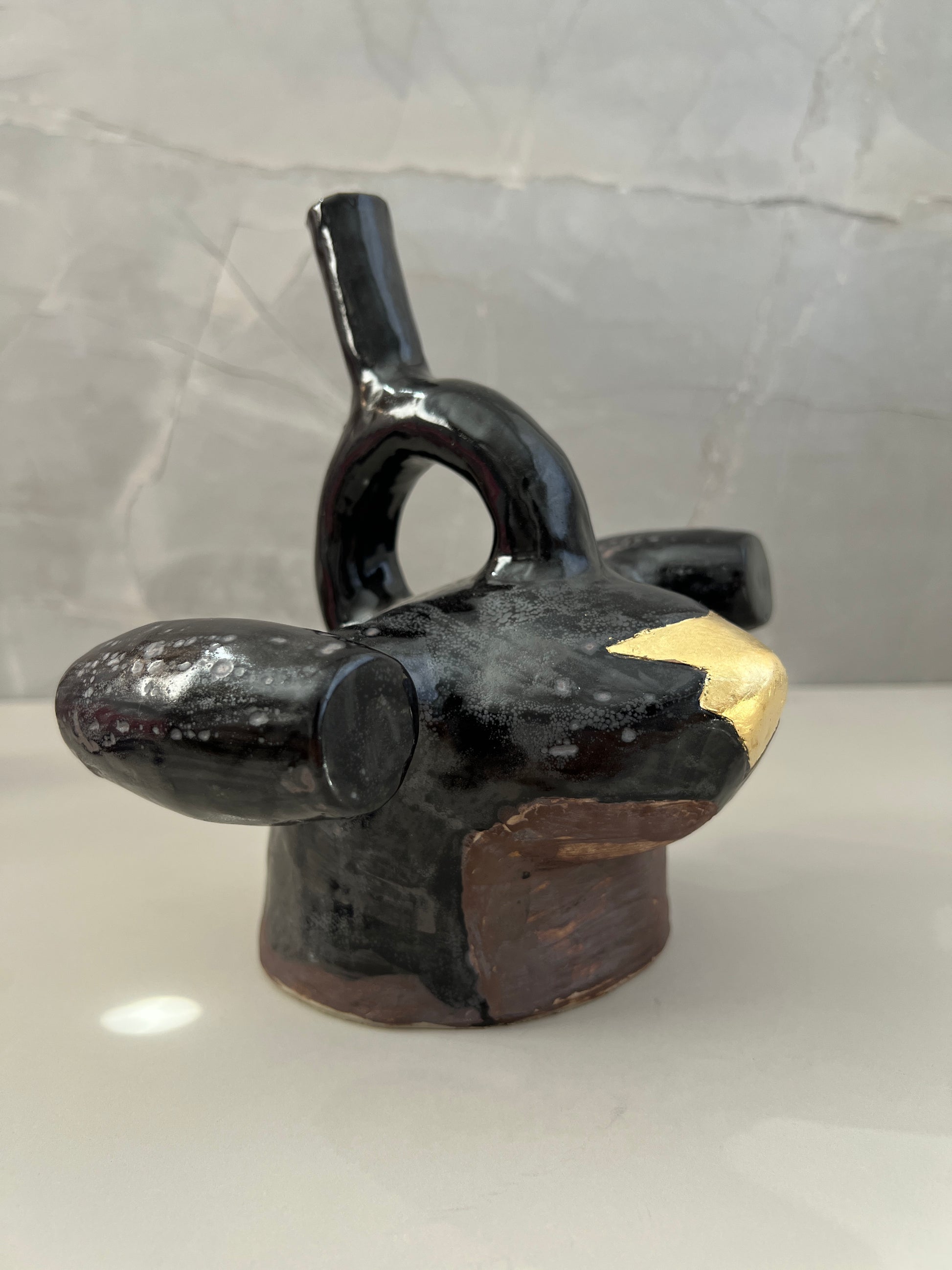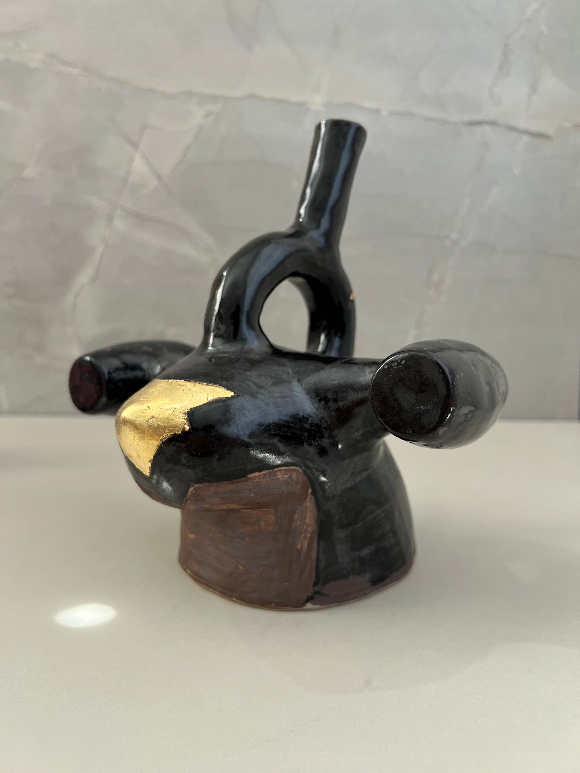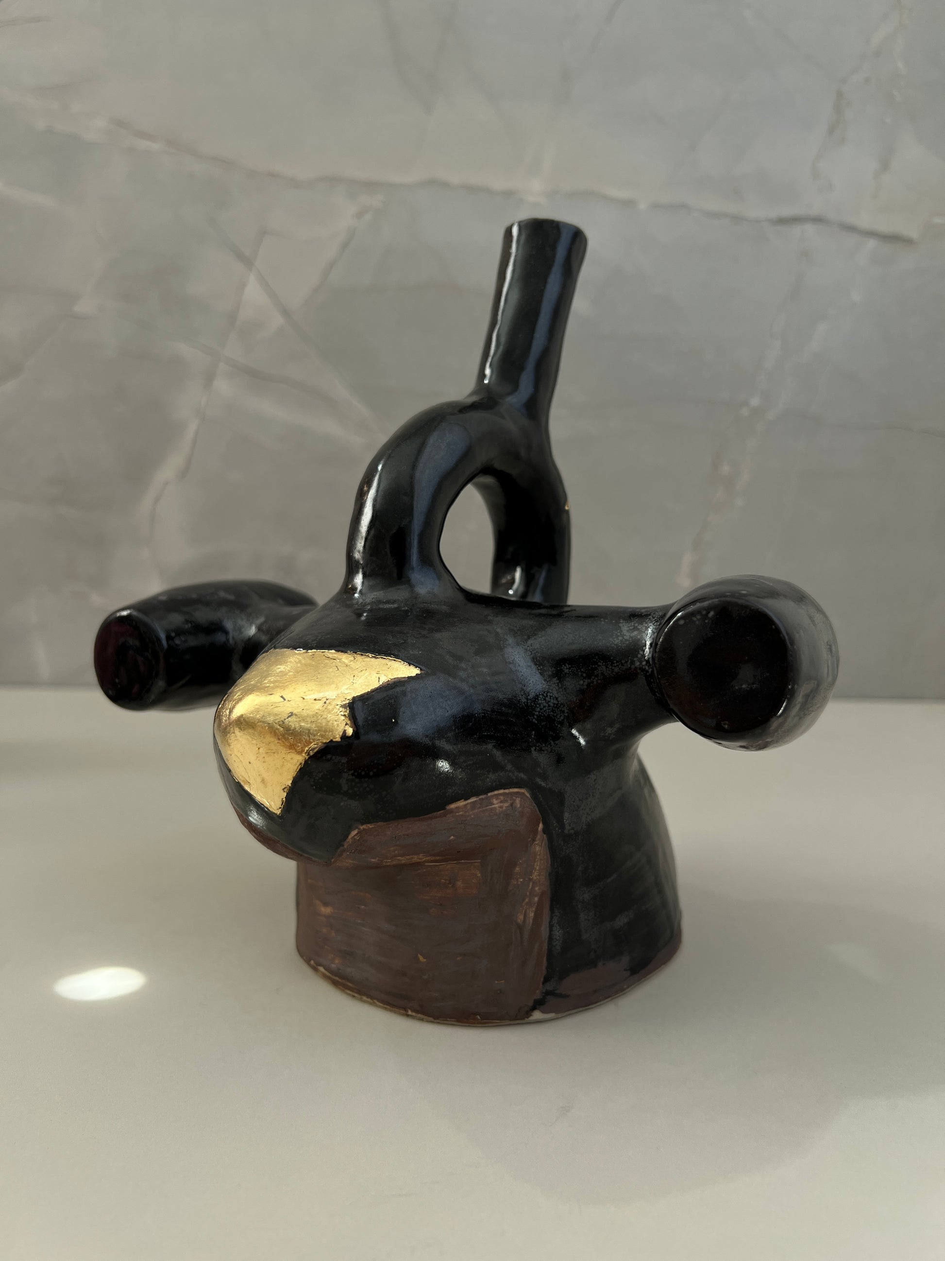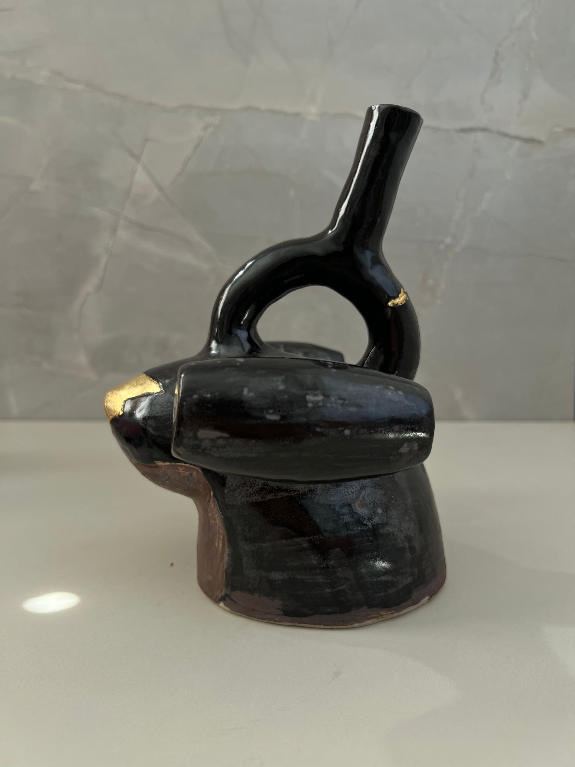 He aquí una cerámica única inspirada en un huaco retrato moche, modelada con la técnica del pellizco, esmaltada y horneada a ~1200°C. Tiene detalles en pan de bronce